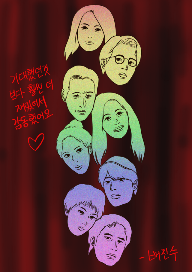 원작자 배진수 작가는 “기대했던 것보다 훨씬 더 재밌어서 감동했어요”라는 메시지와 함께 배우들을 그림으로 담아냈다. 레드 커튼을 배경으로 ‘1층’부터 ‘8층’까지 캐릭터들의 얼굴을 층별로 캐리커처로 표현한 축전은 각 인물이 가진 각양각색의 매력을 부각시키며 이목을 집중시킨다.