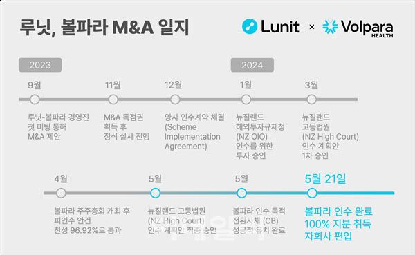 루닛은 지난해 9월 볼파라 경영진과 만나 M&A를 공식 제안했다. 3개월 후 독점적 실사에 착수했고, 12월 인수 계약을 체결했다. 올해 초 뉴질랜드 해외투자규제청(OIO)과 고등법원으로부터 투자 계획안 승인과 1665억원 규모의 자금 조달도 성공적으로 완료하면서 지난 21일 지분 100%를 취득을 최종 완료했다.