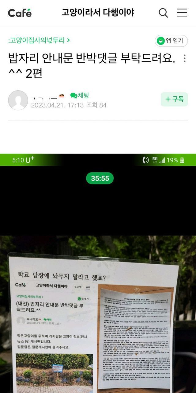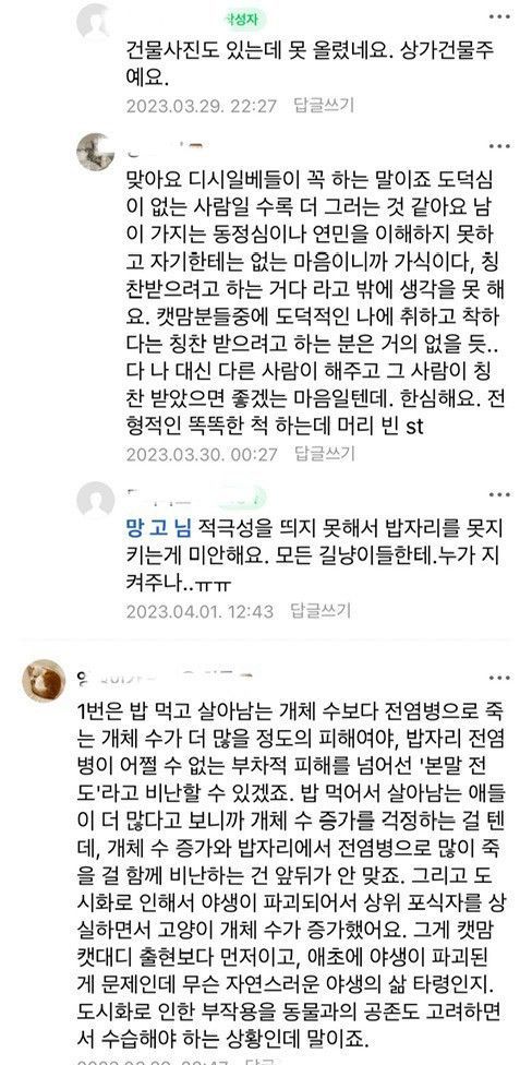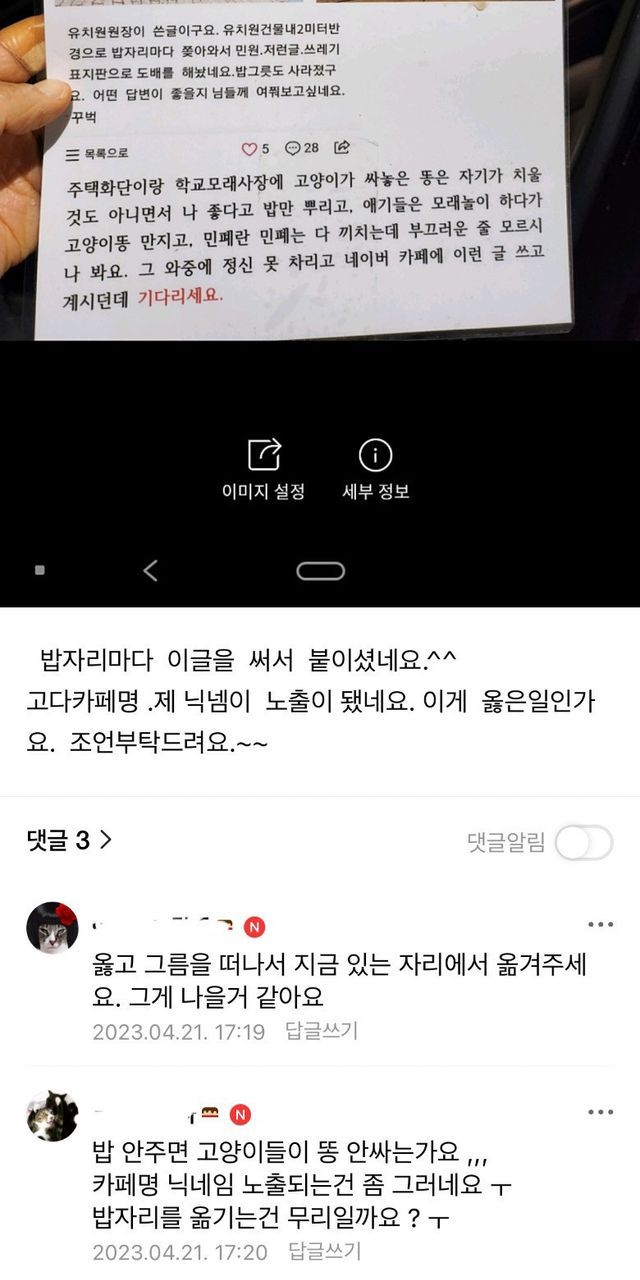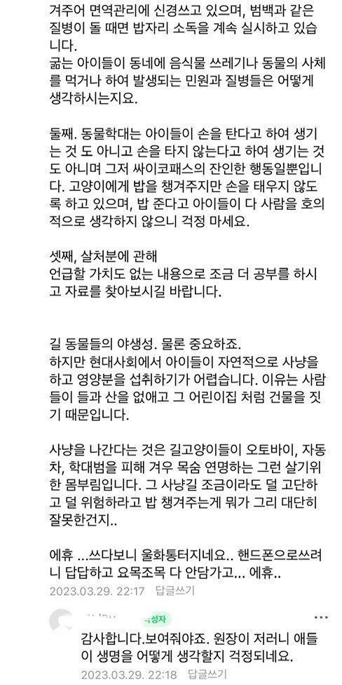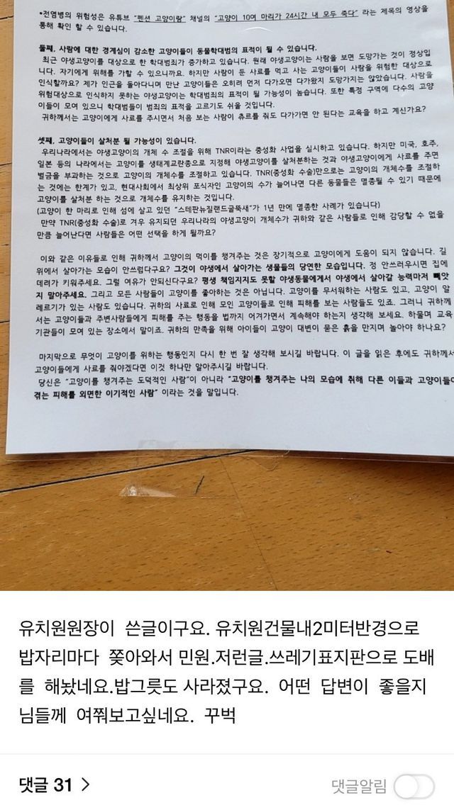 캣맘이 유치원 부지에 밥을 주고 다녀서, 유치원 원장 선생님께서 친절하게도 왜 밥을 놓치 말아야 하는지에 대한 설명을 써서 붙여놓으심.