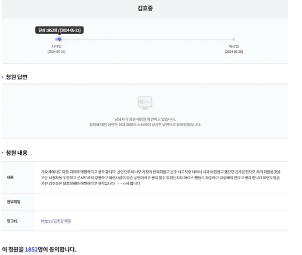 B씨는 "김호중은 가요계에서 퇴출돼야 마땅하다. 공인임에도 거짓말을 반복하고 시청자들을 우롱했으며 콘서트까지 강행했다"며 "이런 사람이 무슨 공인인가. 아리스(김호중 팬클럽) 팬들도 자중하고 각성해야 한다고 생각한다. 두 얼굴을 가진 김호중은 퇴출당해야 마땅하다"고 지적했다. 해당 청원 역시 22일 기준 1,800명이 넘는 동의를 얻었다.