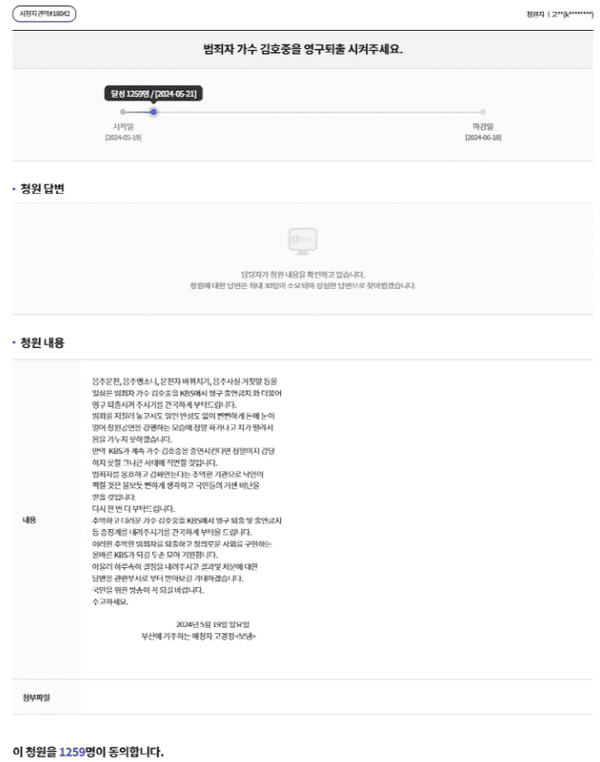 22일 KBS 시청자 청원 게시판에는 김호중 관련 게시글이 여러 건 올라왔다. 그중 1,000명이 넘는 동의를 얻고 있는 청원은 지난 19일 시청자 A씨가 쓴 '범죄자 가수 김호중을 영구 퇴출해 주세요'라는 제목의 글이다.