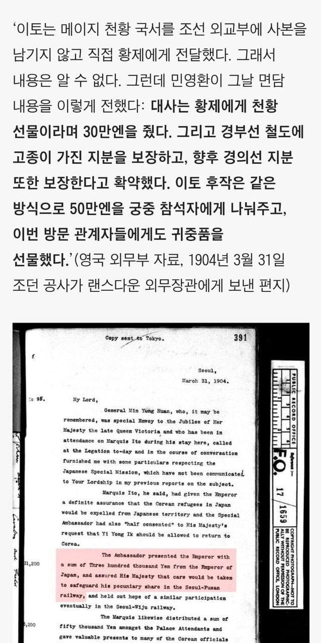 을사조약 직전에 접대비 명목으로 이토 히로부미에게 뇌물 25억원 받아 챙김
