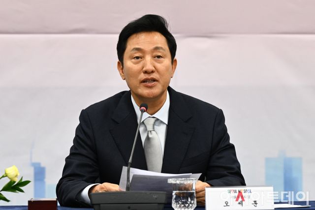 오세훈 서울시장이 22일 오후 서울 중구 서울시청에서 열린 광운대역 물류부지 동북권 新생활·지역경제거점 조성을 위한 '서울시·노원구·HDC현대산업개발 양해각서(MOU) 체결식'에서 인사말을 하고 있다. /정재훈 기자