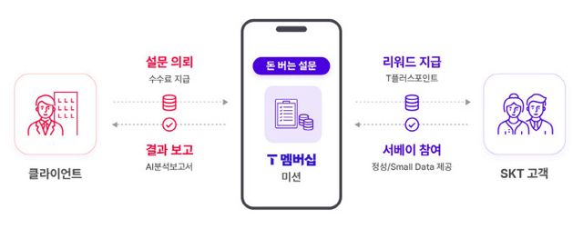 SKT는 22일 기존 고객들이 이용하는 T멤버십 내에 설문 조사 서비스 ‘돈 버는 설문’을 정식 출시했다. T멤버십 이용자들은 설문 조사에 참여하고 제휴처에서 사용 가능한 ‘T플러스 포인트’를 지급 받을 수 있고, 설문을 의뢰하는 기업이나 소상공인들은 일정 금액의 수수료를 내면 결과를 받아볼 수 있는 B2B2C 서비스다.