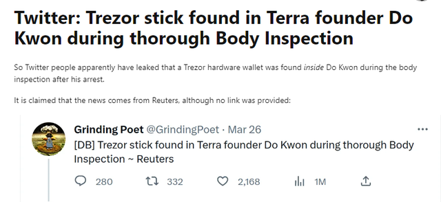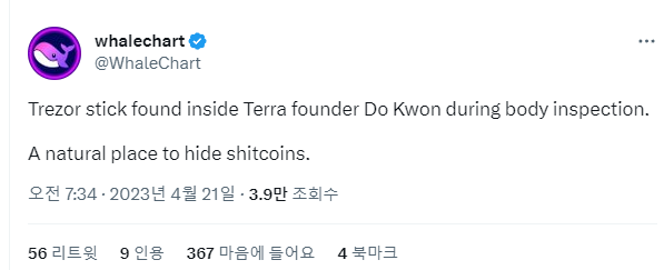 어제 올라온 찌라시중에 권도형 몸수색하다가 몸 “내부”에서 코인 지갑이 발견되었다고함…