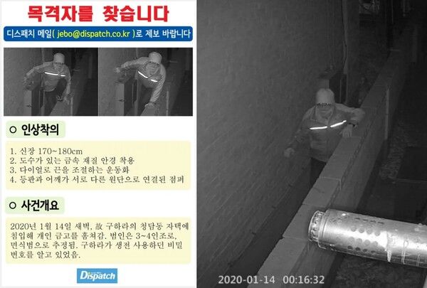 외벽 구조물을 타고 2층 베란다로 진입하여 연결문을 열고 다용도실로 들어가는 식으로 집 안으로 침입하는 데 성공. 2층 베란다를 통해 내부로 들어간 범인은 옷방에 있던 금고만 챙겼다. 구하라의 유족과 가까운 지인 등에게 저택 CCTV에 포착된 범인의 인상착의를 보여주었으나 전부 '누군지 전혀 모르겠다'는 반응이 돌아왔다.