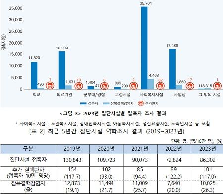 잠복결핵감염 검사 결과, 1만 25명(26.3%)이 양성이었고, 잠복결핵감염률은 교정시설 43.6%, 사회복지시설 34.5%, 사업장 27.6%, 의료기관 26.5% 순으로 확인됐다.