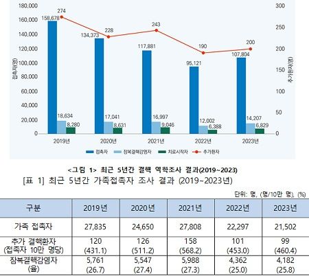 2023년 결핵환자의 가족접촉자(호흡기 결핵환자가 결핵 치료를 시작하는 시점을 기준으로 3개월 이전부터 같은 주거 공간에서 생활한 가족 및 동거인)는 2만 1,502명으로 전년(22,297명) 대비 3.6%(795명)가 감소했다.