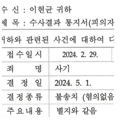 재희는 심경 글과 함께 '불송치(혐의없음)' 처분을 받은 수사결과 통지서 일부를 함께 공개했다.