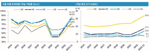 서울 호텔 객실단가(ADR)는 작년 11월 5성급 기준 33만8000원으로, 2019년 당시 20만원대보다 크게 상승했다. 객실점유율, 객실단가 모두 오른 만큼 호텔 수익성도 개선된 것으로 분석된다.