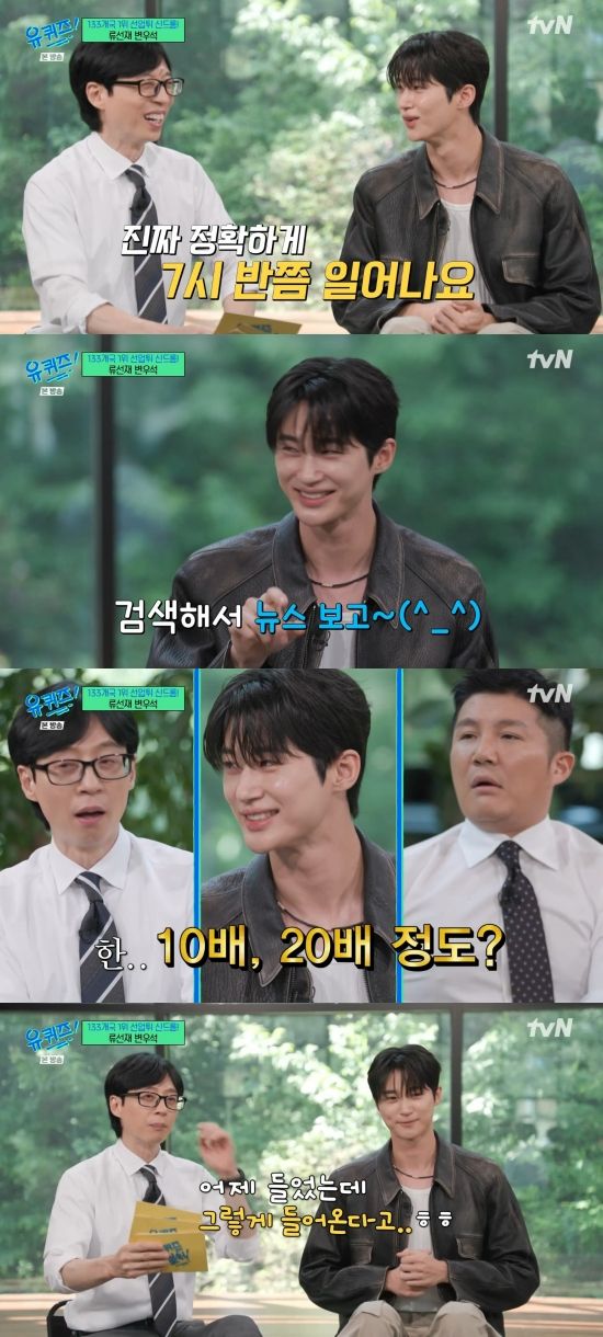 이날 변우석은 '선재 업고 튀어'의 높은 인기에 대해 "저는 방송하는 날 제가 새벽 3시에 자든 4시에 자든 정확하게 정확하게 7시 반쯤 일어난다. 모닝콜을 맞추지 않아도. 8시쯤에 시청률이 나오니까"라며 털어놨다.