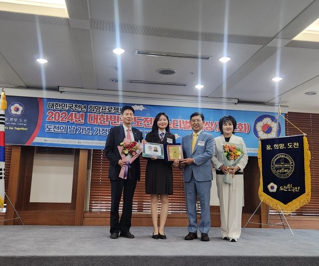 | 지난 21일 한국프레스센터에서 개최된 2024년 서울 도전페스티벌 시상식에서 월드허그파운데이션 세계 학생 대표 서예화 학생(왼쪽 두번째)이 글로벌 리더상을 수상했다. / 사진=도전한국인본부 |
