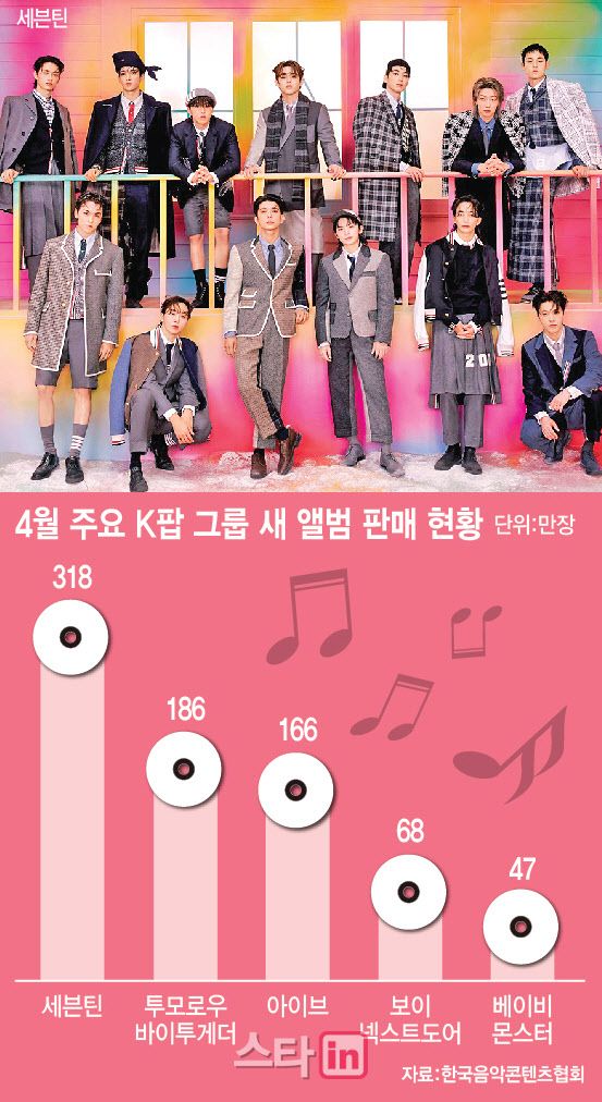 보이그룹 세븐틴과 투모로우바이투게더 그리고 걸그룹 아이브가 ‘밀리언 셀러’를 만들어낸 주인공이다. 이들 중에선 세븐틴의 음반 파워가 가장 거셌다. 세븐틴은 베스트 앨범 ‘세븐틴 이즈 라이트 히어’(17 IS RIGHT HERE)로 318만장의 판매고를 올렸다. 이전 발매작들의 판매량까지 합치면 세븐틴 홀로 달성한 4월 월간 판매량만 328만장이 넘는다. 4월 톱400 앨범 내 세븐틴의 점유율은 25.4%로 나타났다.