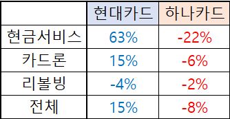 현대카드는 현금서비스 중심으로 카드대출을 늘렸다. 여신금융협회에 따르면 올해 3월 현금서비스 잔액은 6537억원으로 전년 동기 4012억원 대비 63% 급증했다. 우리카드(0.9%)와 현대카드를 제외한 곳들은 모두 감소했다.