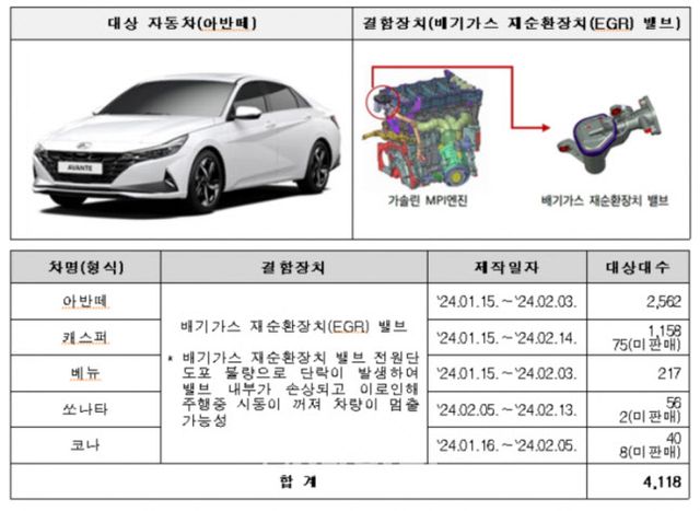 현대 아반떼 등 5개 차종 4118대와 기아 K3 등 3개 차종 2668대는 주행 중 시동이 꺼져 차량이 멈출 가능성이 확인돼 오는 13일부터 시정조치한다. 시동 꺼짐은 배기가스 재순환장치(EGR) 밸브 전원단 도포가 불량인 탓이다.
