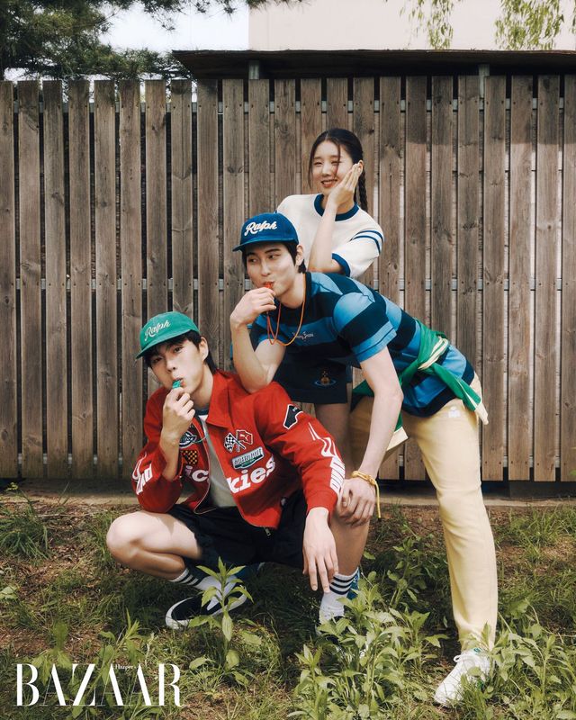 (위부터) 백은송이 착용한 티셔츠는 46만원대 Golden Goose. 스커트는 68만원대 Vivienne Westwood. 유남균이 착용한 스트라이프 톱은 6만원대 Tommy Jeans. 허리에 두른 티셔츠는 8만원대 Adidas Originals. 팬츠는 79만원대 Isabel Marant. 볼캡은 Polo Ralph Lauren. 로프 팔찌는 Miu Miu. 스니커즈는 11만원대 Nike. 김기범이 착용한 패치워크 장식 재킷은 34만원대 Puma × Dickies. 톱은 9만원대 Recto. 쇼츠는 43만원 Juun J. 볼캡은 Polo Ralph Lauren. 슬립온은 Loewe. 양말은 에디터 소장품.
