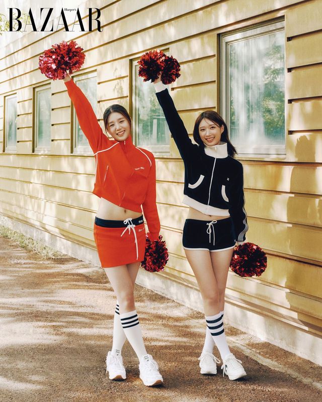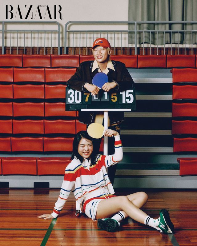 (왼쪽부터) 백은송이 착용한 트랙 재킷, 스커트, 브리프는 모두 Miu Miu. 스니커즈는New Balance × Miu Miu. 차승현이 착용한재킷, 쇼츠, 스니커즈는 모두 Celine by Hedi Slimane. 니삭스는 에디터 소장품.