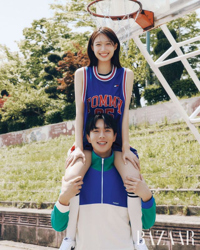 박종범이 착용한 트리밍 디테일 재킷, 셔츠, 팬츠는 모두 Louis Vuitton. 볼캡은 4만원대 New Balance. 심예지가 착용한 테리 소재 톱은 29만원대, 쇼츠는 19만원대 Polo Ralph Lauren. 스니커즈는 13만원대 New Balance. 양말은 에디터 소장품.