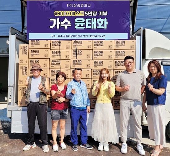 23일 좋은날엔엔터테인먼트측에 따르면 윤태화는 지난 22일 파주시에 있는 사단법인 한국 곰두리봉사단 파주지회에 하이아라 마스크 5만 장을 기부했다.