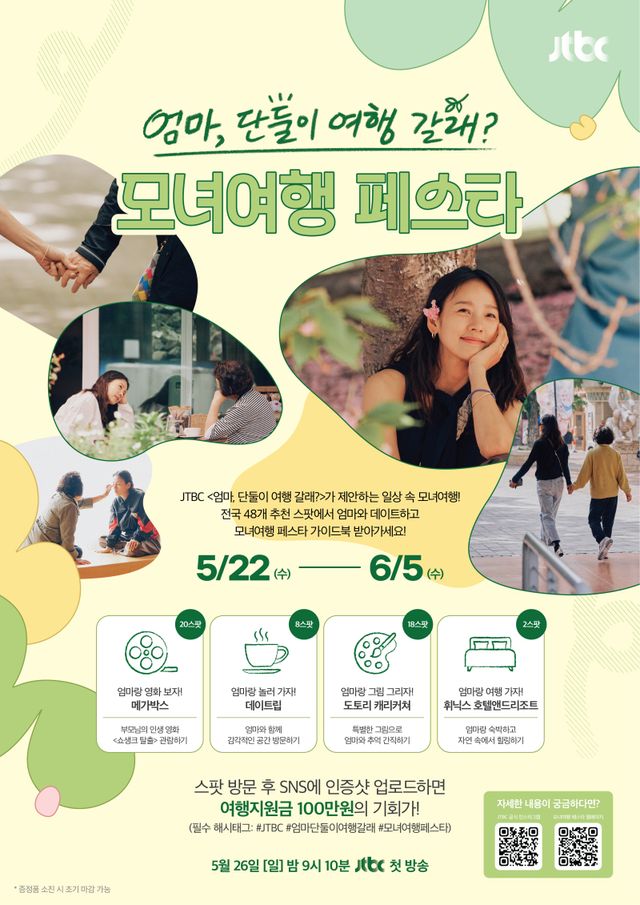 이런 가운데 ‘엄마, 단둘이 여행 갈래?’가 첫 방송을 앞두고 ‘모녀여행 페스타’를 진행한다. 이번 프로모션은 당장 멀리 떠나기 어려운 전국의 엄마와 딸들을 위한 이벤트로 영화관, 카페 등 일상 속 데이트 스팟 48곳을 모녀가 함께 방문할 경우 방송 이미지가 담긴 엽서와 여행 가이드북, 스티커가 포함된 프로그램 굿즈를 받을 수 있다. SNS에 스팟 방문 인증샷을 남기면 추첨을 통해 100만원 상당의 여행 상품권 당첨 기회도 주어진다.