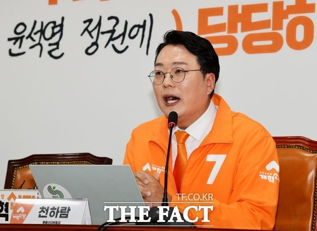 천 당선인은 최근 더불어민주당 지도부가 '대통령 탄핵론'을 공식 석상에서 거론하는 데 대해 "윤 대통령이 불행한 결과를 얻지 않도록 민의와 거스르는 권력형 비호를 하지 말라는 취지의 경고 메시지"라며 "개혁신당도 같은 취지에서 대통령께 특검을 수용하라고 강하게 말씀드리는 것"이라고 설명했다. 국민의힘을 향해서는 "탄핵 얘기를 꺼내는 것 자체가 방자하다라고 할 상황이 아니다. 현재 윤 대통령 지지율은 박근혜 전 대통령이 통치 가능성을 상실하기 직전 지지율 수준"이라며 "민심은 이미 윤 대통령을 심판 혹은 외면을 하고 있다는 점을 더 엄중하게 받아들여야 한다"고 촉구했다.