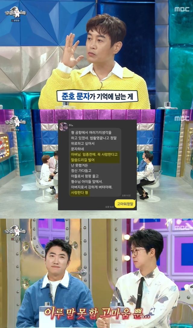 이어 "(김)준호 문자가 기억이 남는 게, '임종 전에 꼭 사랑한다고 말씀드려라'고 하더라. 마지막에 '사랑해'라고 해줬는데 그 문자가 정말 감동이었다"고 말했다.