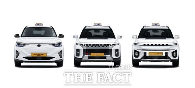KGM은 23일 (왼쪽부터) '코란도 EV 택시', '더 뉴 토레스 바이퓨얼 LPG 택시', '토레스 EVX 택시' 등 중형급 택시 3종을 앞세워 국내 택시 시장에 진출한다고 밝혔다. /KGM
