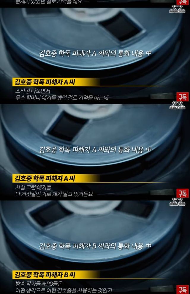 공개된 영상에는 김호중의 경북예고 1년 후배 피해자 A씨의 인터뷰가 담겼다. 학교폭력 피해자 A씨는 김호중이 과거 얼굴을 알렸던 예능 '스타킹'에서의 감동일화가 모두 거짓이며, 일대기가 담긴 영화 '파파로티' 또한 미화된 작품이라며 고통을 호소했다.