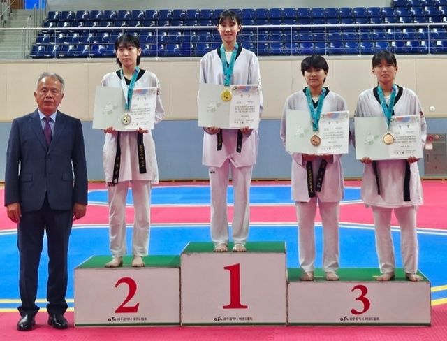 광주 518민주화운동기념 시장기 전국 남여중고 태권도 대회에서 우승한 김시우(가운데).