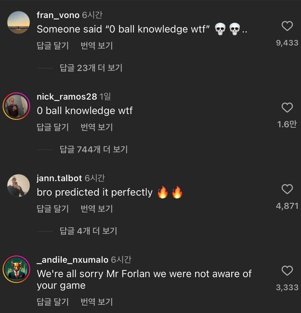 게시글 경기 전후 댓글은 극명하게 갈렸다. 경기 전에는 ‘하나도 맞힌 게 없음’이라고 달렸다가, 경기 후에는 ‘누군가 하나도 맞힌 게 없다고 말했는데’라는 댓글이 달렸다. 다른 이는 ‘우리 모두 포를란이 알았던 걸 몰라봬서 죄송하다’며 포를란만 정확히 사태를 꿰뚫어봤다고 찬양했다.