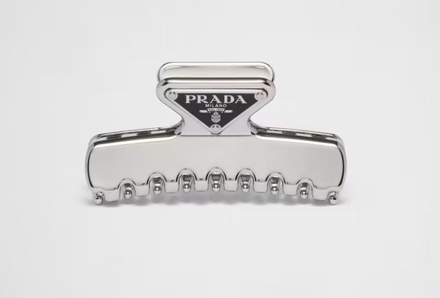 높이 4cm, 가로 10cm의 프라다 메탈 헤어 클립. 밋밋한 헤어 스타일에 포인트하기 좋은 헤어 클립. 한쪽 끝 부분이 트라이 앵글 로고로 장식되어 있다.