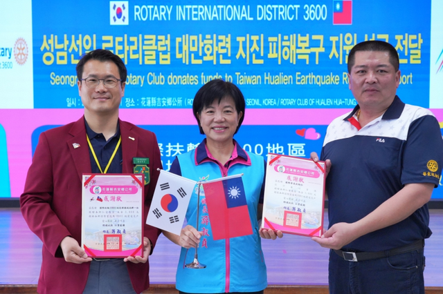 국제로타리 3600지구 성남선일로타리클럽은 지난 20일 대만화련현 지안향공소에 지진 피해복구 지원금 3000달러를 전달했다고 21일 밝혔다.