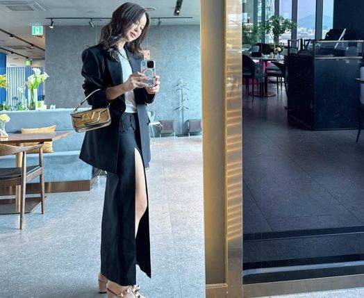 사진 속 백지영은 종아리를 넘어 허벅지까지 시원하게 트인 디자인의 롱스커트를 입고 있다.