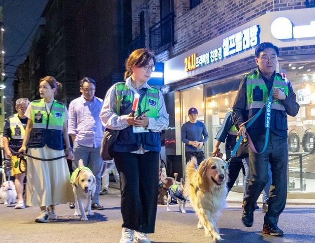 보호자와 반려견이 한 팀을 이룬 총 33개팀이 4개조로 나눠 순찰에 나섰다. 진교훈 구청장은 서울시 지자체장으로서는 최초로 함께 동행하며 힘을 보탰다.