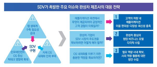 삼정KPMG는 SDV가 부상하게 된 배경으로 △미래 자동차 발전 방향성 △소프트웨어 기반 통합형 제어 시스템 △차량 연비 향상 △소비자 편의성 확대를 꼽았다. 보고서는 “서비스 추가·변경·삭제를 지원하는 유연성이 요구되는 SDV를 완벽히 구현하기 위해서는 소프트웨어 플랫폼 확보가 필수적”이라며 “소프트웨어 플랫폼이 원활하게 작동하기 위해 차량용 운영체제가 반드시 필요하기 때문”이라고 설명했다.
