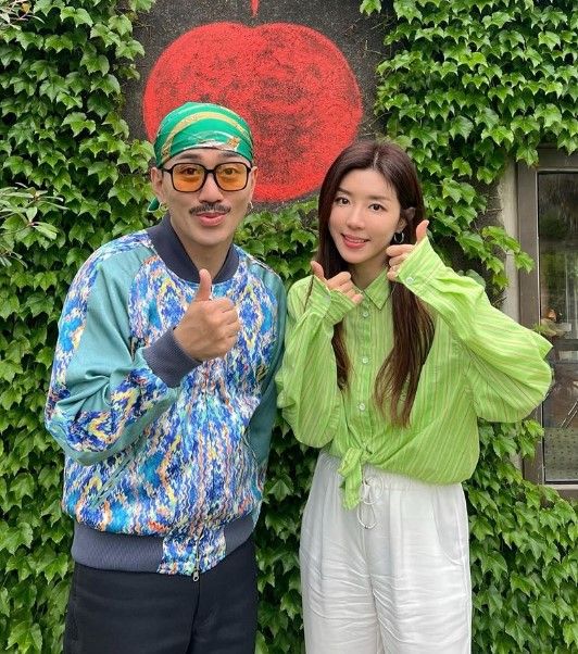 사진 속 박한별은 다양한 부캐로 활동 중인 개그맨 김경욱과 유명 챌린지 '잘자요 아가씨' 포즈를 한 채 서 있다.