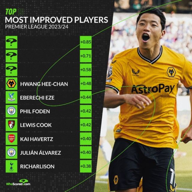 이 부문 1위는 앤서니 고든(뉴캐슬 유나이티드)이다. 2022~23시즌보다 평균 평점이 무려 0.85 뛰었다. 코너 갤러거(첼시) 필 포든(맨체스터 시티) 카이 하베르츠(아스널) 히샤를리송(토트넘) 등도 톱10에 이름을 올렸다.