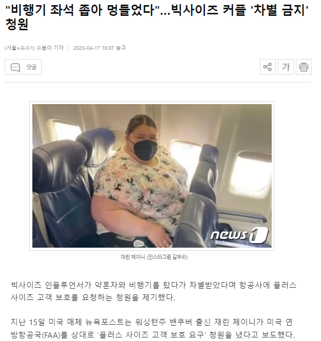그녀의 청원 요구 사항: 무료 추가 좌석 or 승객 크기에 따른 2~3개 무료 여분 좌석 제공