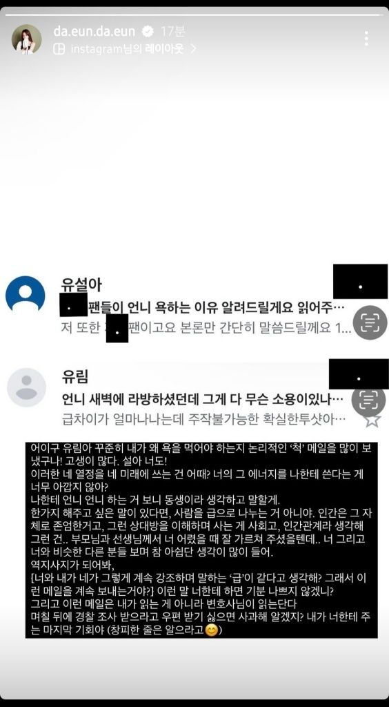 송다은은 지난 22일 자신의 SNS에 악플 캡처본을 올리며 “꾸준히 내가 왜 욕먹어야 하는지 논리적인 척 메일을 많이 보냈구나. 고생이 많다. 이러한 네 열정을 네 미래에 쓰는 건 어때? 너의 그 에너지를 나한테 쓴다는 게 너무 아깝지 않아?”라고 적었다.