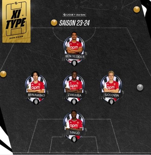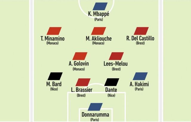 레퀴프가 발표한 이번 시즌 리그1 베스트에서 챔피언 파리 생제르맹(PSG)과 모나코 그리고 브레스트가 나란히 3명을 배출해 총 9자리를 차지했다. 나머지 2자리는 OGC니스 선수들이 뽑혔다.