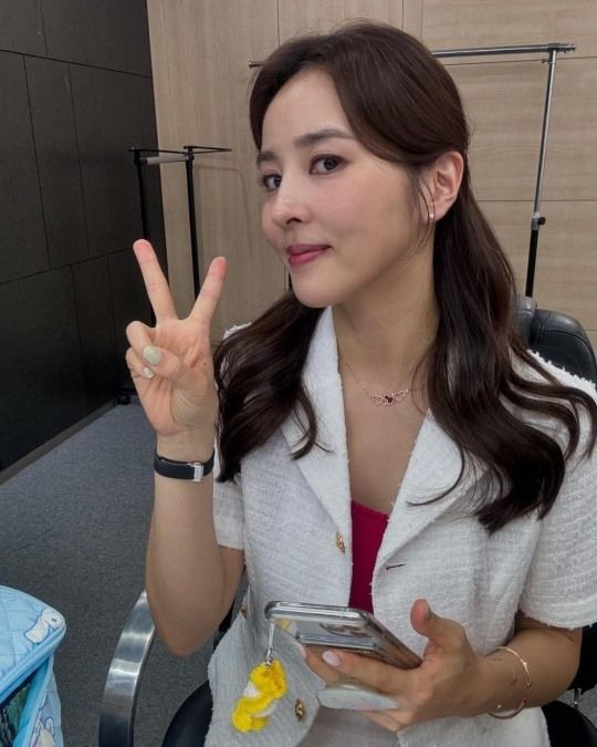 공개된 사진에는 V 포즈로 사진을 찍고 있는 한혜진의 모습이 담겼다. 40대라는 나이가 믿기지 않는 미모를 자랑하고 있다.