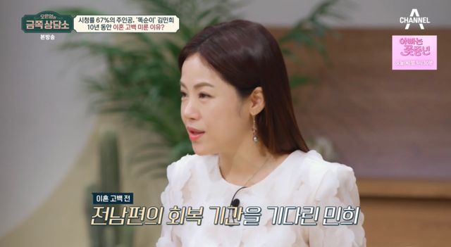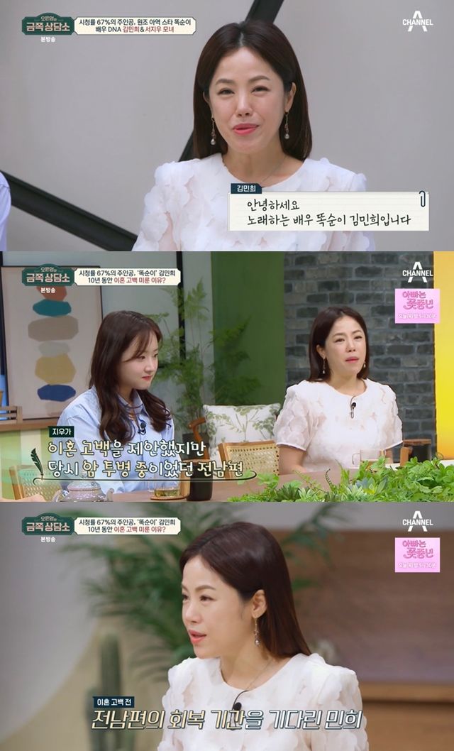 김민희는 "딸이 이혼 사실 고백을 제안했지만, 당시 전남편이 암 투병 중이었다. 전남편이 회복되기를 기다린 거다. 지금은 많이 회복됐다. 편하게 얘기할 수 있는 시기를 (기다린 게) 10년이었다"라고 전했다.