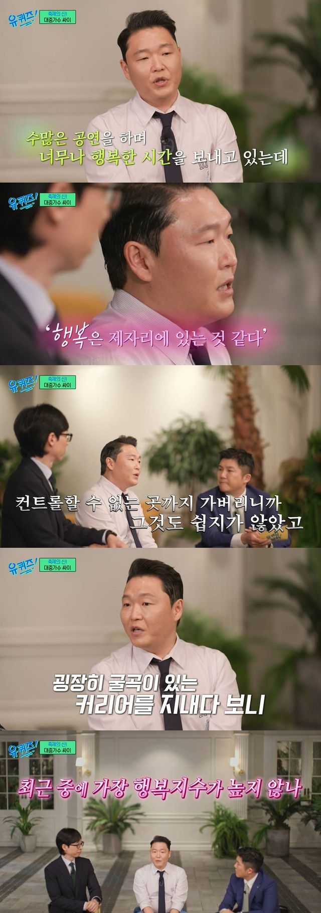 싸이는 제 가수로 성장하기까지 겪었던 비화를 전하며 "(현재는) 우리나라에서 너무나 재밌고 행복한 시간을 보내고 있는데 그래서 깨달은 건 행복은 제자리에 있는 것 같다고 말을 한다"고 이야기했다.