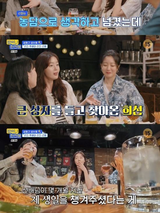 23일 방송된 tvN '밥이나 한잔해'에서는 한선화가 김희선에게 생일선물을 받은 사연을 밝힌 장면이 전파를 탔다.