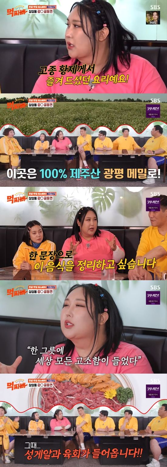 풍자는 "메밀면이 보통 다른 데서는 잘 끊겨서 밀이나 쌀을 섞는 경우가 많은데, 이곳은 100% 제주산 광평 메밀로만 만든다. 한 그릇에 세상 모든 고소함이 들어 있다"고 소개했다.