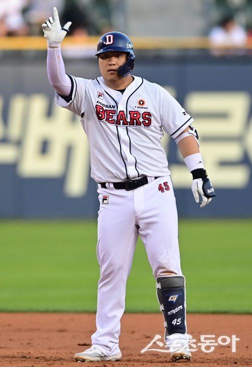 23일 서울 잠실야구장에서 열린 ‘2024 신한 SOL 뱅크 KBO리그’ 두산 베어스와 SSG 랜더스의 경기에서 2회말 무사 만루 두산 김기연이 선제 2타점 우전 2루타를 친 후 세리머니를 하고 있다. 잠실 | 주현희 기자 teth1147@donga.com