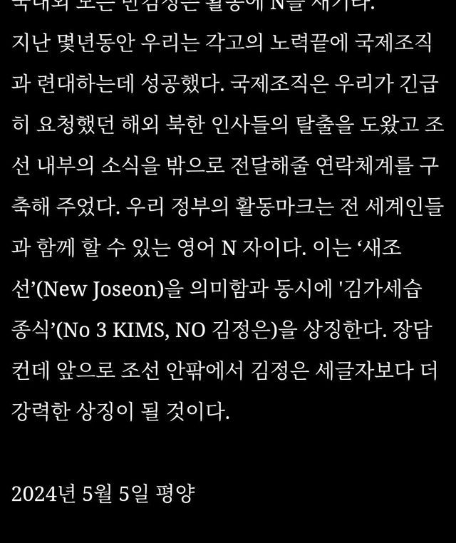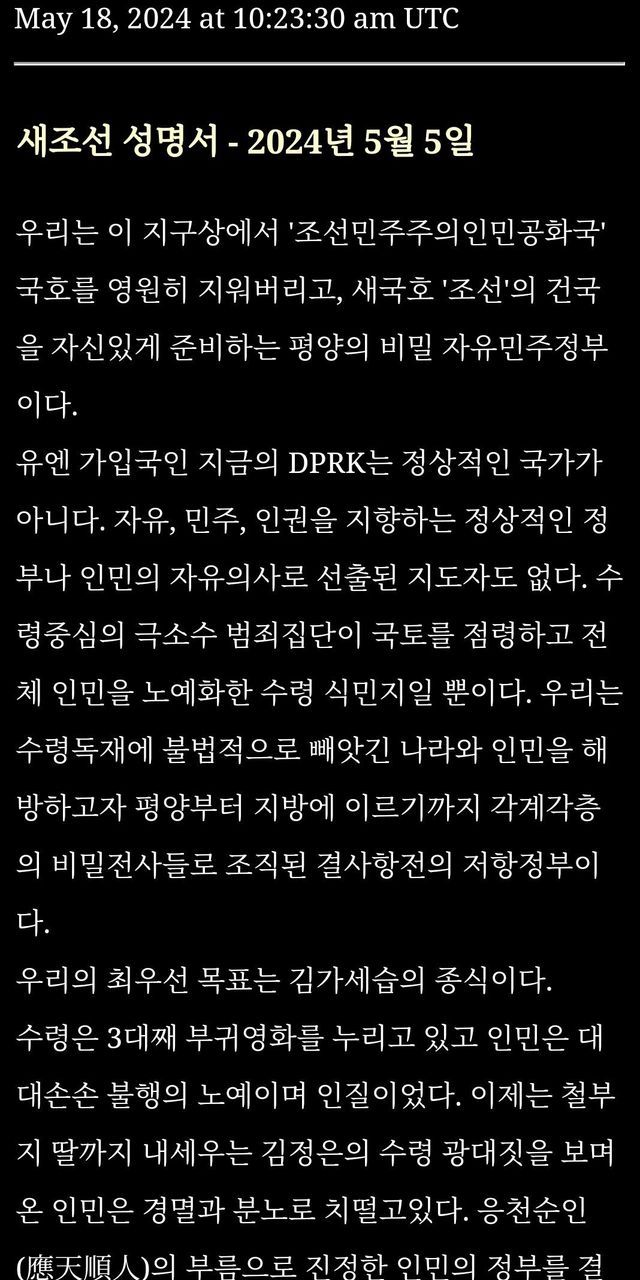 지난해 결성된걸로 보이는 새조선은 이달 초 성명을 발표하고 "김정은 제거를 목표로 북한 내 각계각층 비밀전사로 조직됐다"고 주장했습니다.