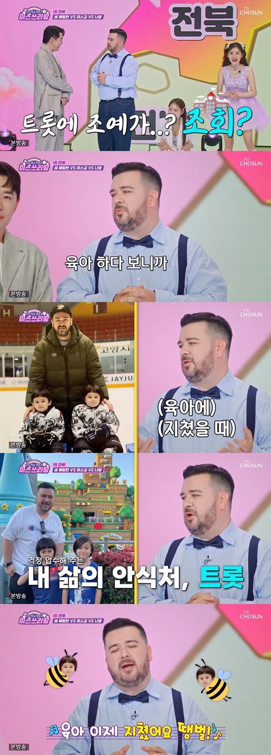 이어 샘 해밍턴은 "육아하다 보니 솔직히 힘들지 않냐. 트롯 들을 때 기분이 업되고 걱정거리가 사라진다. 윌리엄과 벤틀리를 잊을 수 있는 시간"이라고 트롯을 좋아하는 이유를 공개했다.