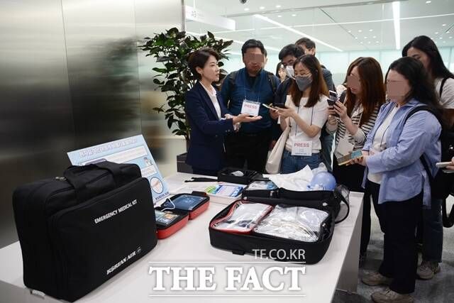 23일 최윤형 대한항공 항공의료센터장이 기자들을 대상으로 항공기에 탑재되는 '의료 키트'를 설명하고 있다. /김태환 기자