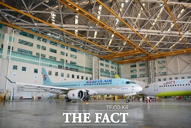 23일 대한항공 서울 강서구 본사에 위치한 정비격납고에 대한항공 에어버스 A220 항공기(왼쪽)와 진에어 보잉 737 항공기가 정비를 받고 있다. /김태환 기자